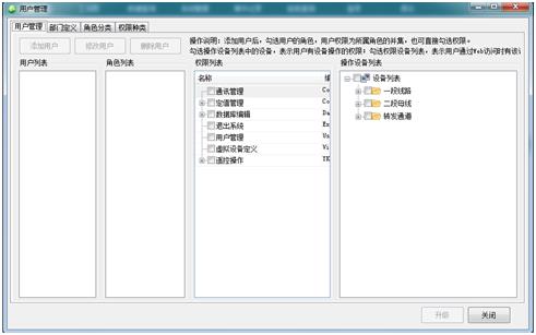 在二級菜單上點擊【用戶管理】按鈕,彈出用戶管理界面。可編輯部門、角色、用戶、角色權限和用戶權限。