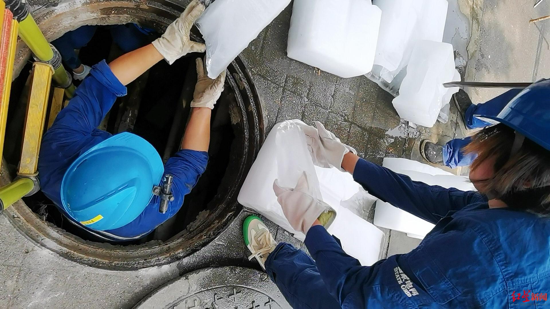“咱們趕緊把這些冰塊搬到井底,別融化了。”國(guó)網(wǎng)成都供電公司電纜運(yùn)檢中心電纜運(yùn)檢四班班長(zhǎng)關(guān)惠方看著井蓋旁邊正在融化的冰塊,同隊(duì)員快速采取行動(dòng),開展井底鋪冰降溫措施。