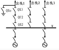 單母線接線圖見圖1。圖中倒閘操作:如對饋線LI送電時,須先合上隔離開關QS2和QS3,再投人斷路器QF2;如欲停止對其供電,須先斷開QF2,然后再斷開QS3和QS2。即隔離開關相對于斷路器而言要“先通后斷”,母線隔離開關相對于線路隔離開關也要“先通后斷”。接地開關QS4是在檢修電路和設備時合上,取代安全接地線的作用。