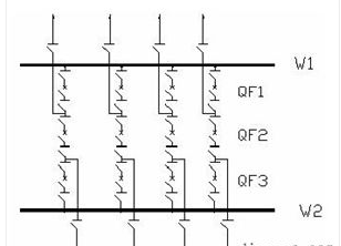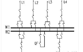 雙母線接線見圖5。具有兩組母線W1、W2。每回線路都經一臺斷路器和兩組隔離開關分別與兩組母線連接,母線之間通過母線聯絡斷路器QF(簡稱母聯)連接,每一個電源回路也是通過一臺斷路器和兩組母線隔離開關接在兩組母線上。