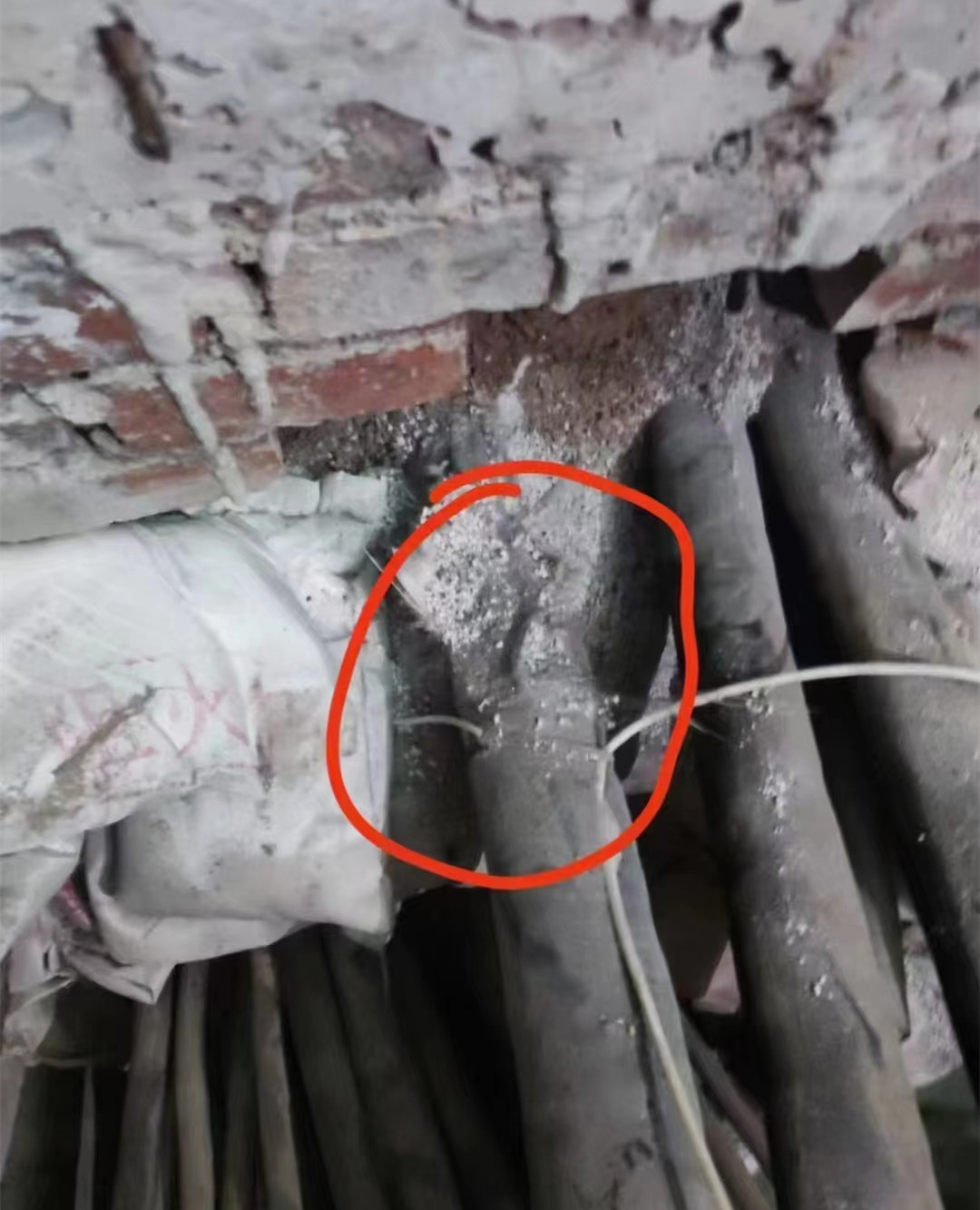 經過查找確認在故障點兩?左右附近聽?微弱放電聲?,??在這附近開挖,挖開后發現有電纜破損修復的痕跡。